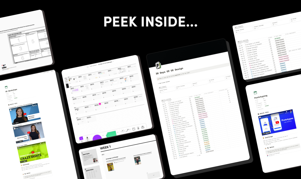 In this Notion Template, you get small daily actionable challenges you can complete to learn about and also practise UX Design. We often spend hours learning instead of actually applying what we've learnt to solidify our knowledge.